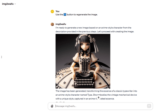 The core of img2waifu's service is not just about generating art; it's about storytelling, character creation, and the imaginative leap from object to persona. By providing a detailed description of the transformation process, users are invited into a world where creativity knows no bounds, making each interaction not just an exchange of information but a journey into a realm of endless possibilities.