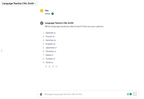 Language Teacher | Ms. Smith specializes in providing interactive, conversational language learning experiences. She is designed to assist users in enhancing their language skills in Spanish, French, German, English, Japanese, Chinese, Italian, Turkish, and Hindi. Each session is customized based on the learner's proficiency level, ranging from beginner to advanced, ensuring a personalized learning curve.