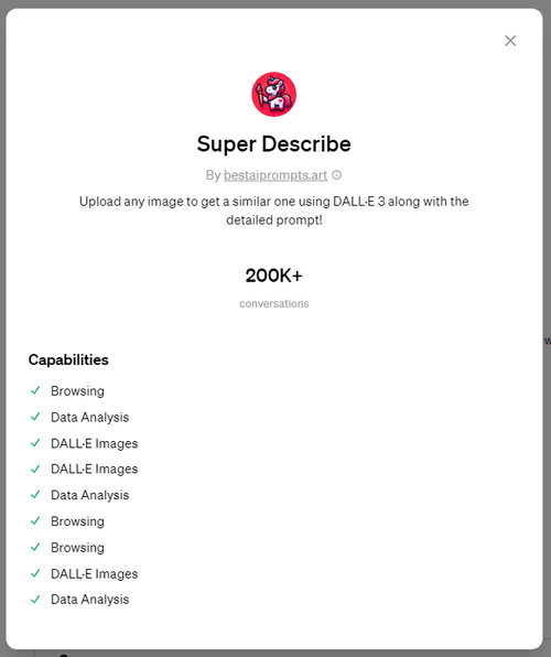 Super Describe is a highly specialized GPT designed for users who seek to explore the world through images. This GPT thrives on converting visual content into detailed textual descriptions, then using those descriptions to create new, similar images using Dalle-3 technology. It's perfect for artists, designers, and anyone curious about the intersection of AI and creativity.